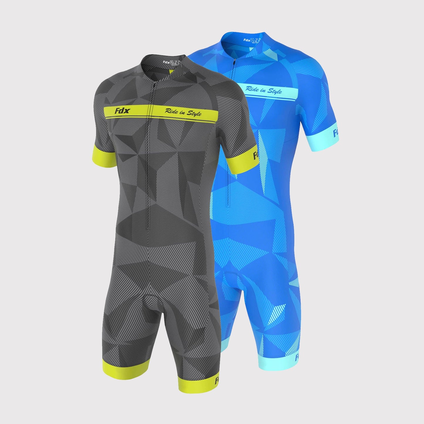 Designed to be highly Aerodynamic, our Classic Suit for Cycle Race & High Intensity Training is fully compatible with the demands of biking in cold and hot weather conditions. Suited to the highest performance levels of athletes, we have made this high quality and durable short sleeve bike riding bodysuit with high moisture wicking and breathable fabric. The Hi-Vis, High Speed Bike Clothing for men & women by FDX comes in Blue & Yellow colors. Enjoy chafing free training and race day with our Short Sleeve Skin suit with Anti BAC 3D Gel Padding and stretchable leg grippers that prevent ride up. Whether you're racing or speed training for the sport, this lightweight & quick dry cycling suit has your back.